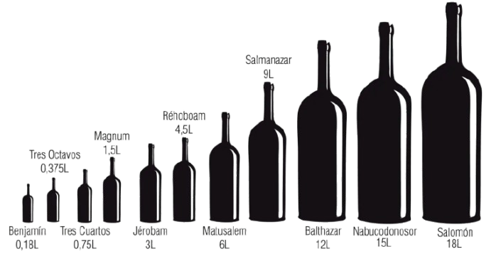 Existen algunos tamaños más con nombres igual de épicos: Baltasar (12 litros), Nabucodonosor (15 litros), Melchor o Solomon (18 litros) hasta Melchizedek (30 litros).